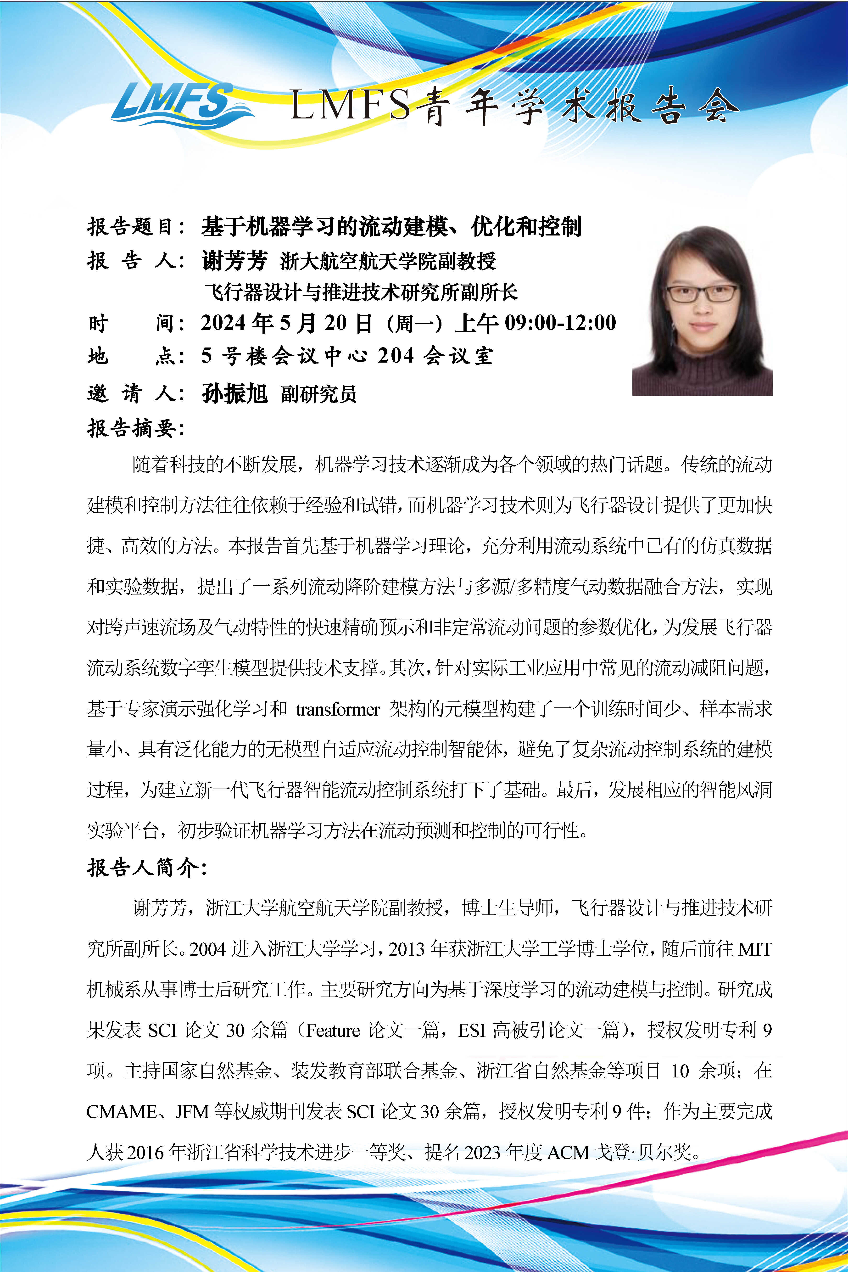 LMFS 青年学术报告 5月20日9:00-12:00, 会议中心204会议室 )基于机器学习的流动建模、优化和控制