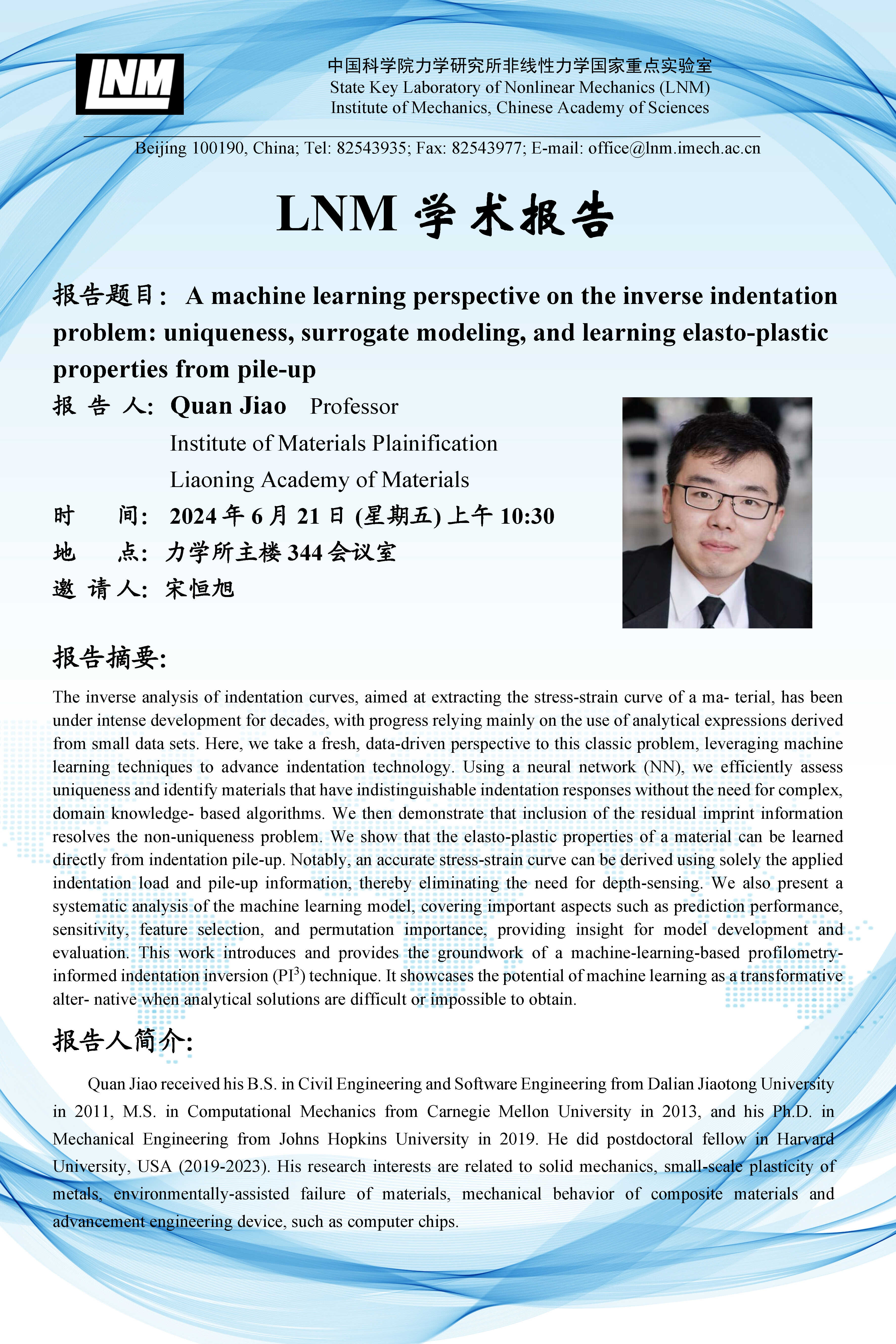 (LNM 6月21日 10:30 1号楼344会议室)A machine learning perspective on the inverse problem indentation: uniqueness, surrogate modeling, and learning elasto-plastic properties from pile-up