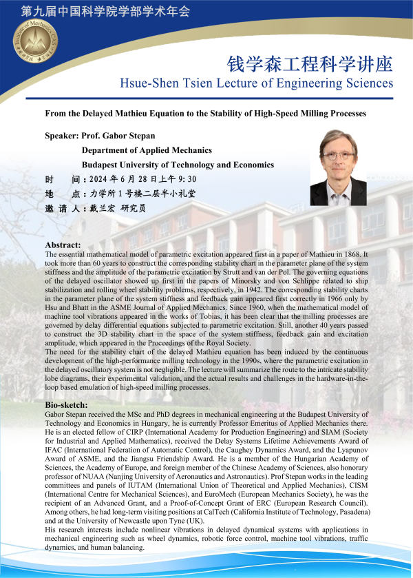 (钱学森工程科学讲座 6月28日 9:30Q彩网1号楼礼堂)From the Delayed Mathieu Equation to the Stability of High-Speed Milling Processes