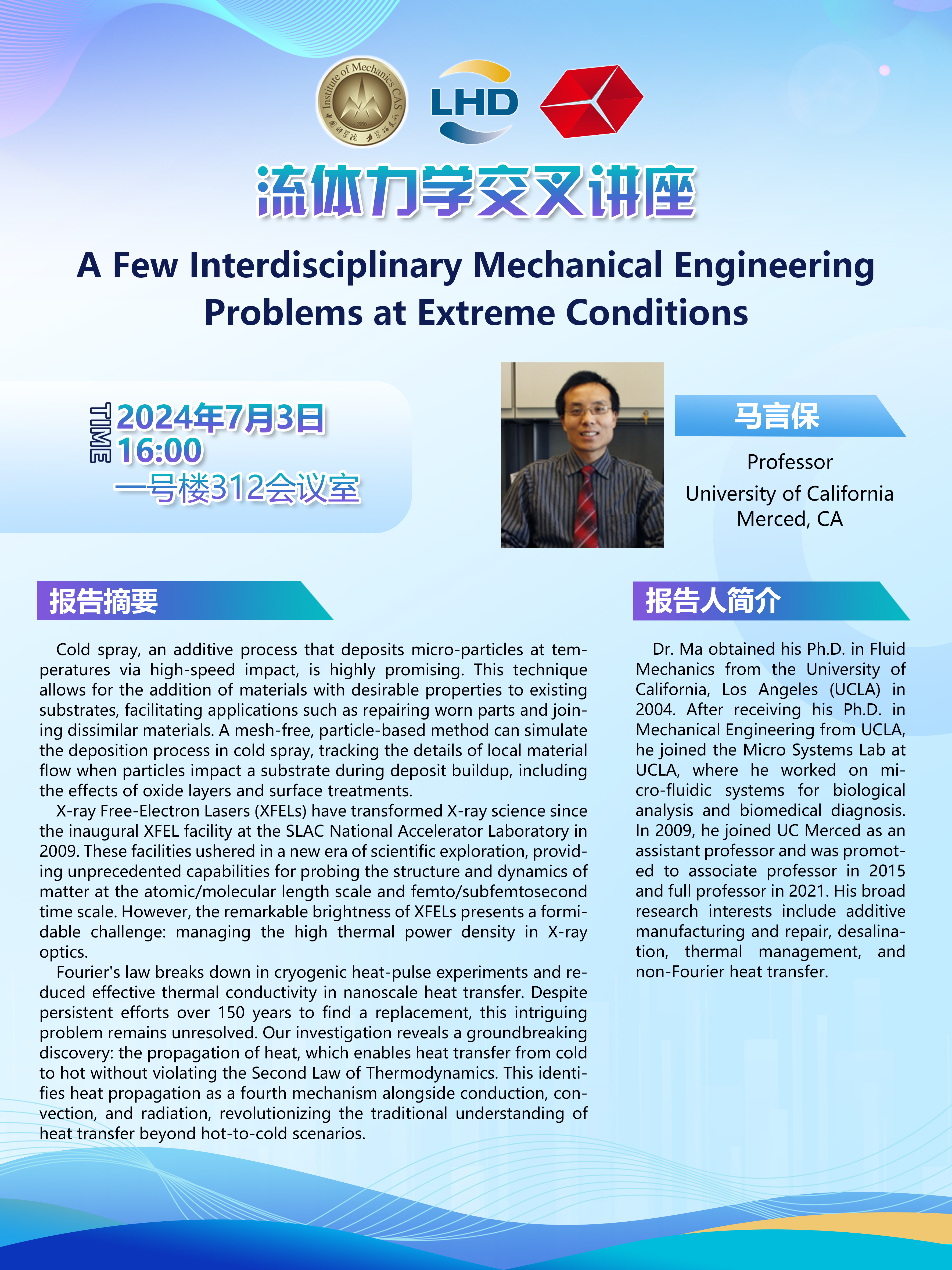 (LHD流体力学交叉讲座 7月3日 16:00 一号楼312会议室)A Few Interdisciplinary Mechanical Engineering Problems at Extreme Conditions