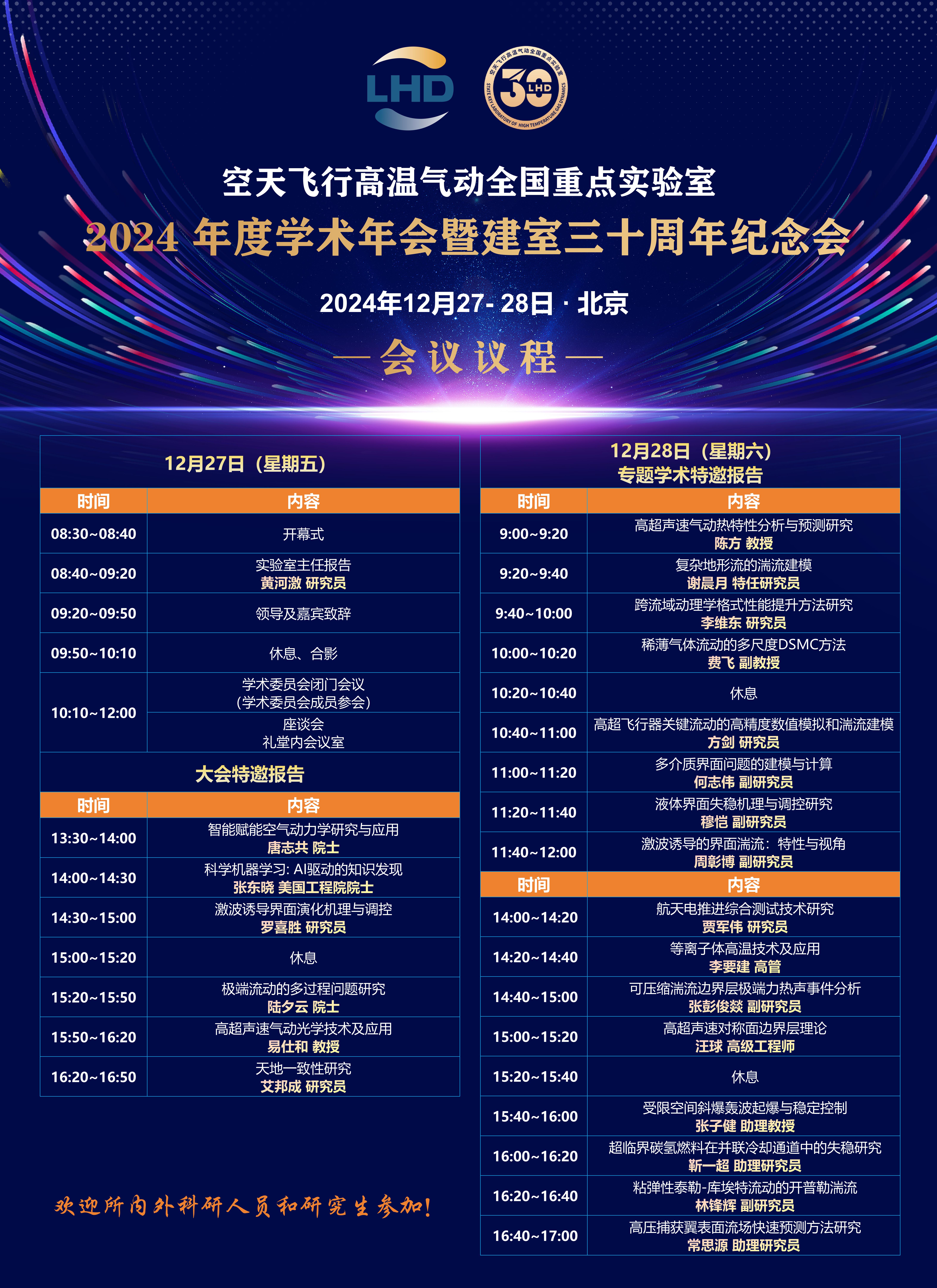 (LHD 12月27-28日 1号楼礼堂)空天飞行高温气动全国重点实验室2024年度学术年会暨建室三十周年纪念会