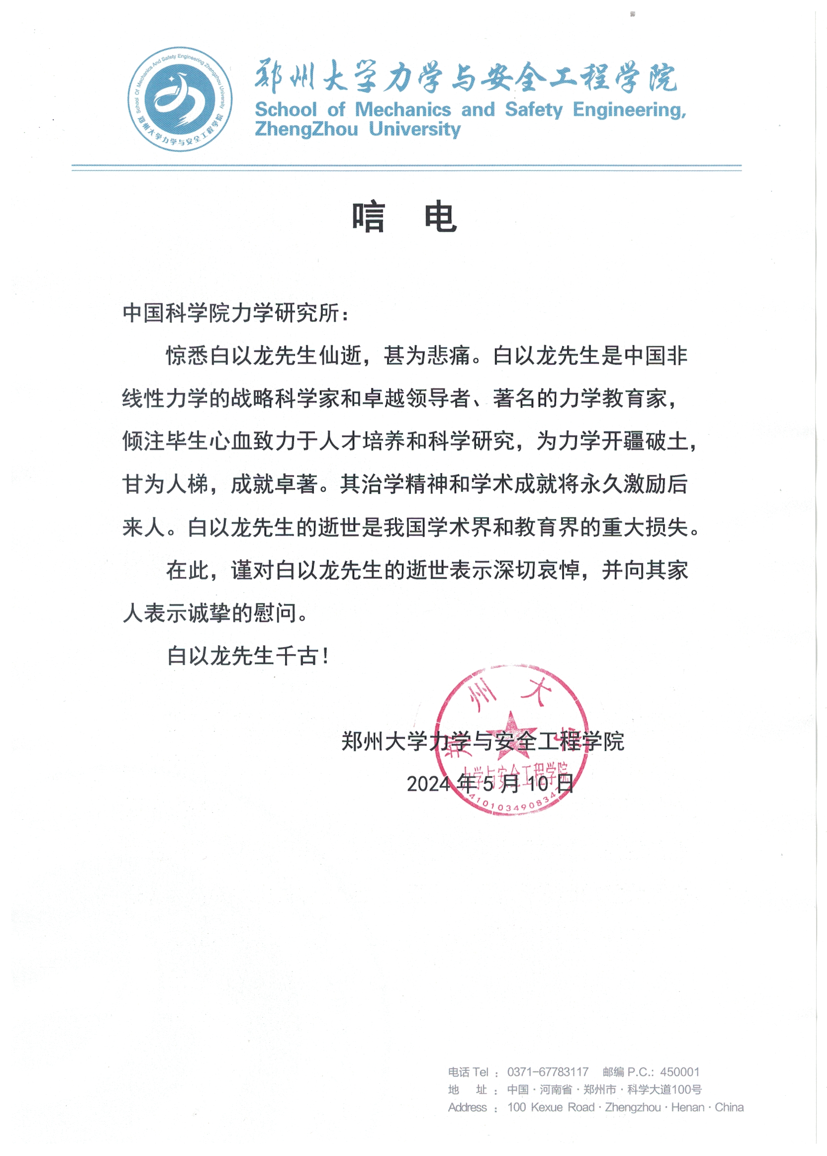 郑州大学力学与安全工程学部唁电