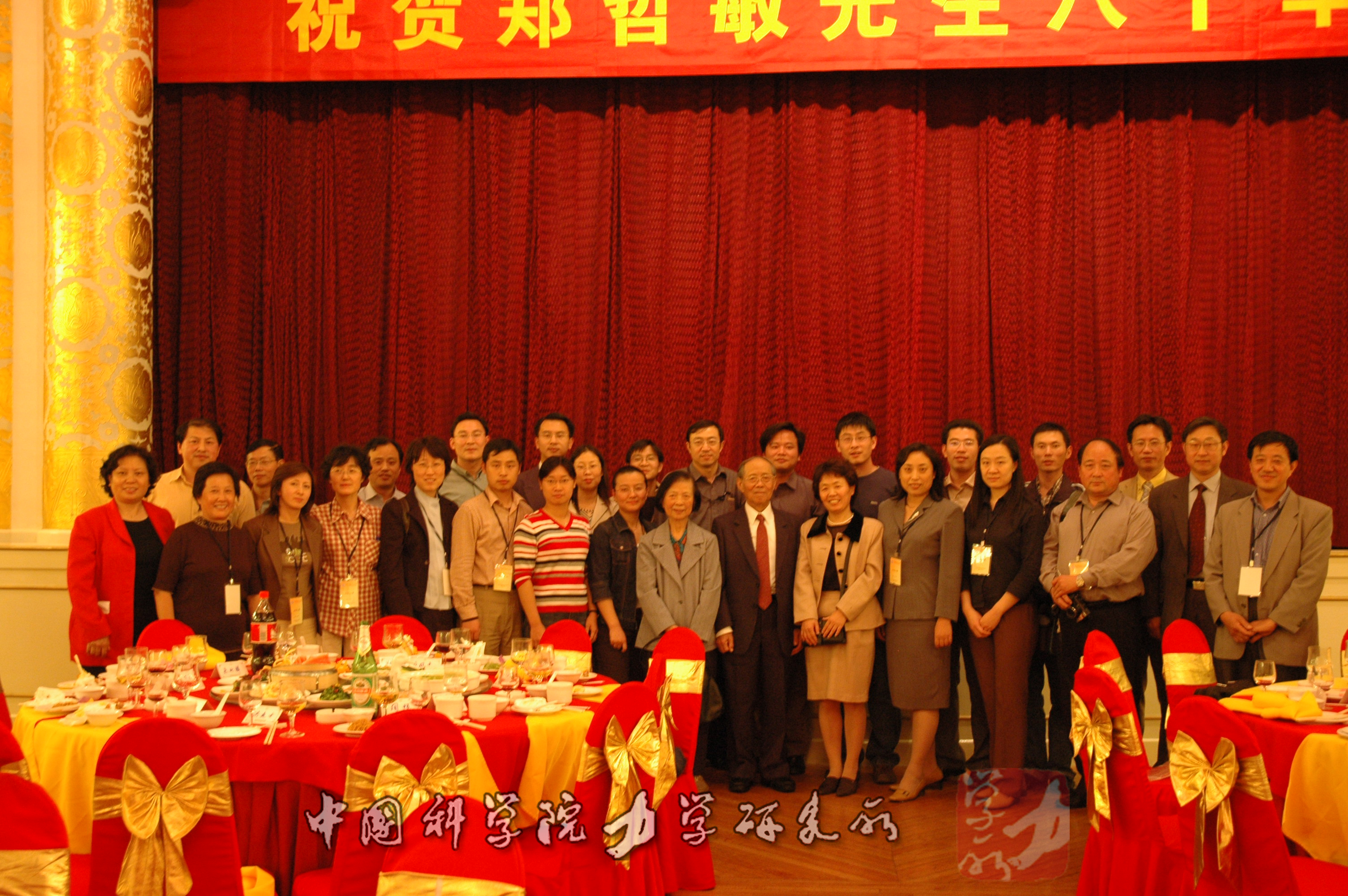 2004年Q彩网举行祝贺郑哲敏八十华诞大会,左一李和娣,左七孟庆国,左九杨亚政,左十一何林,右二洪友士,右三樊菁,右十一黄晨光,右十二郑哲敏,右十四卢凤才