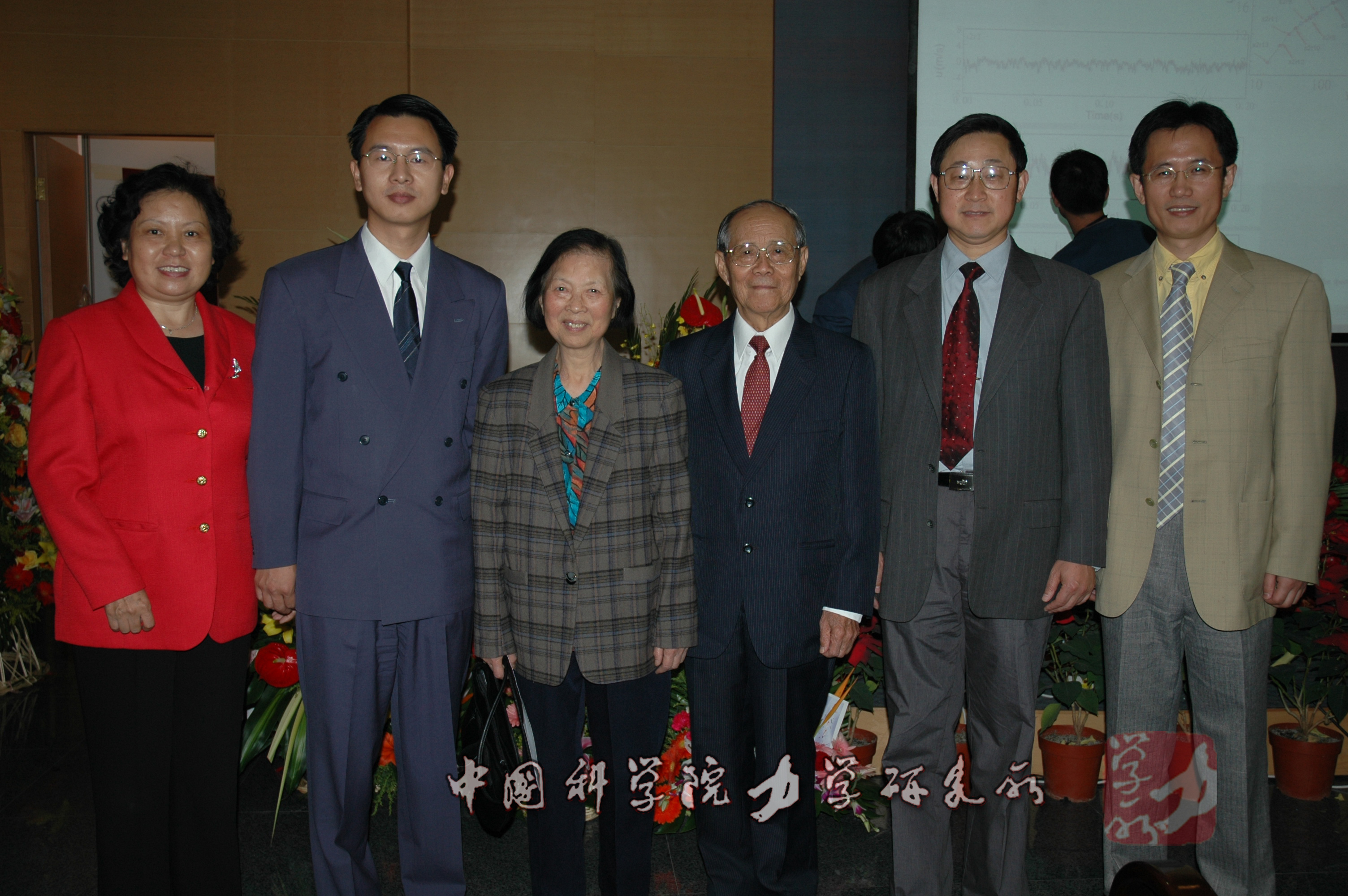 2004年Q彩网领导举行祝贺郑哲敏院士八十华诞应用力学报告会,右起樊菁,洪友士,郑哲敏,卢凤才,何林,李和娣