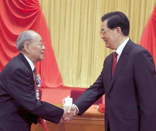 国家主席胡锦涛向郑哲敏院士颁发奖励证书(来源:新华社)