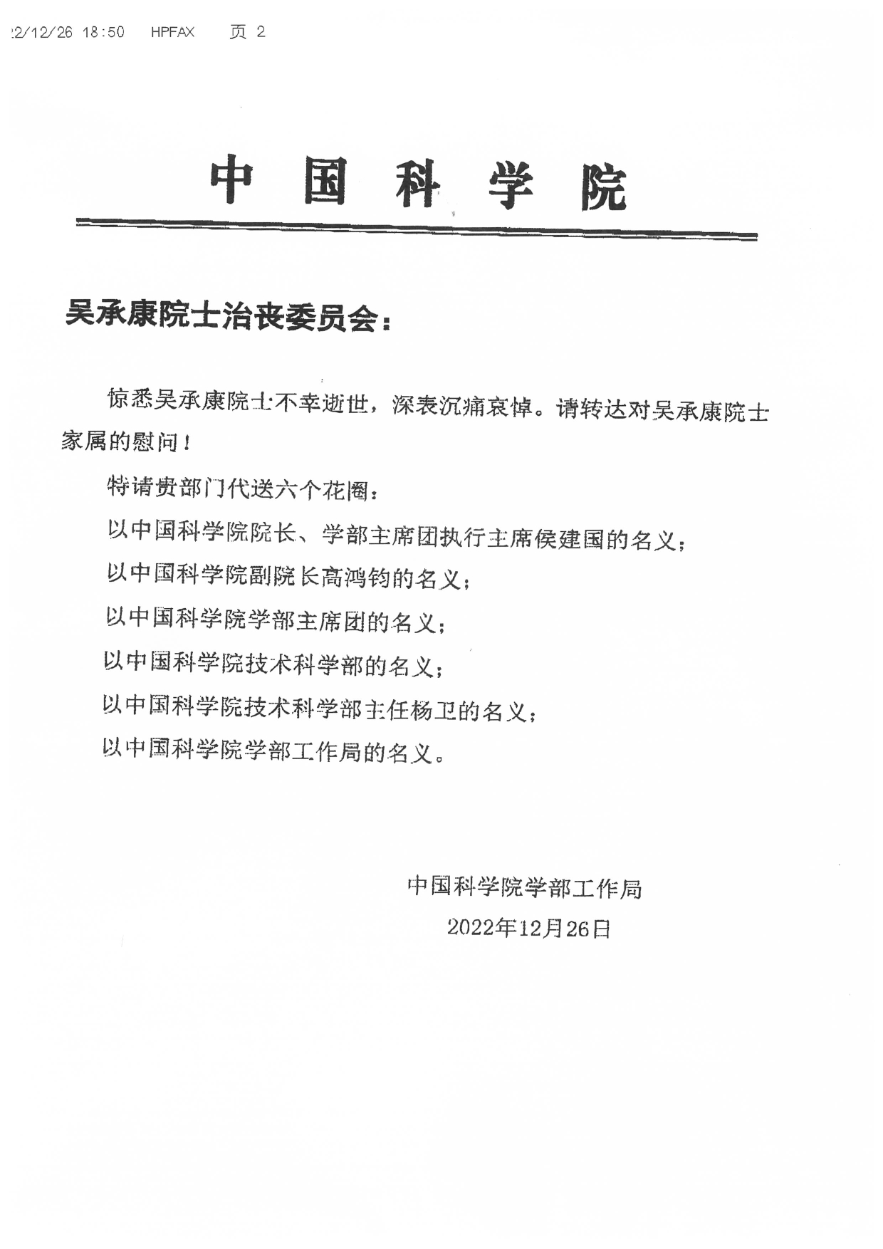 中国科学院学部工作局致唁电