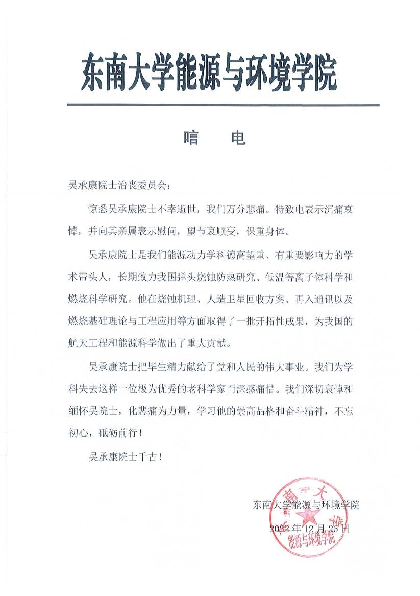 东南大学能源与环境学院致唁电