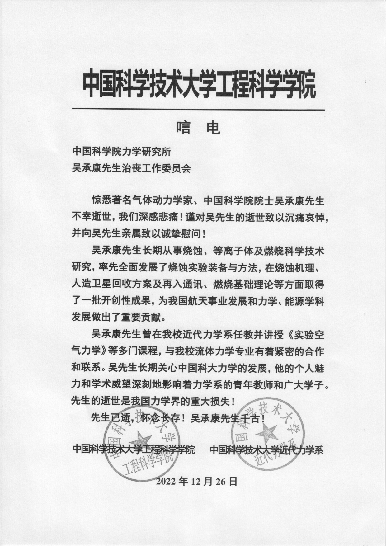 中国科学技术大学工程科学学院、近代力学系致唁电