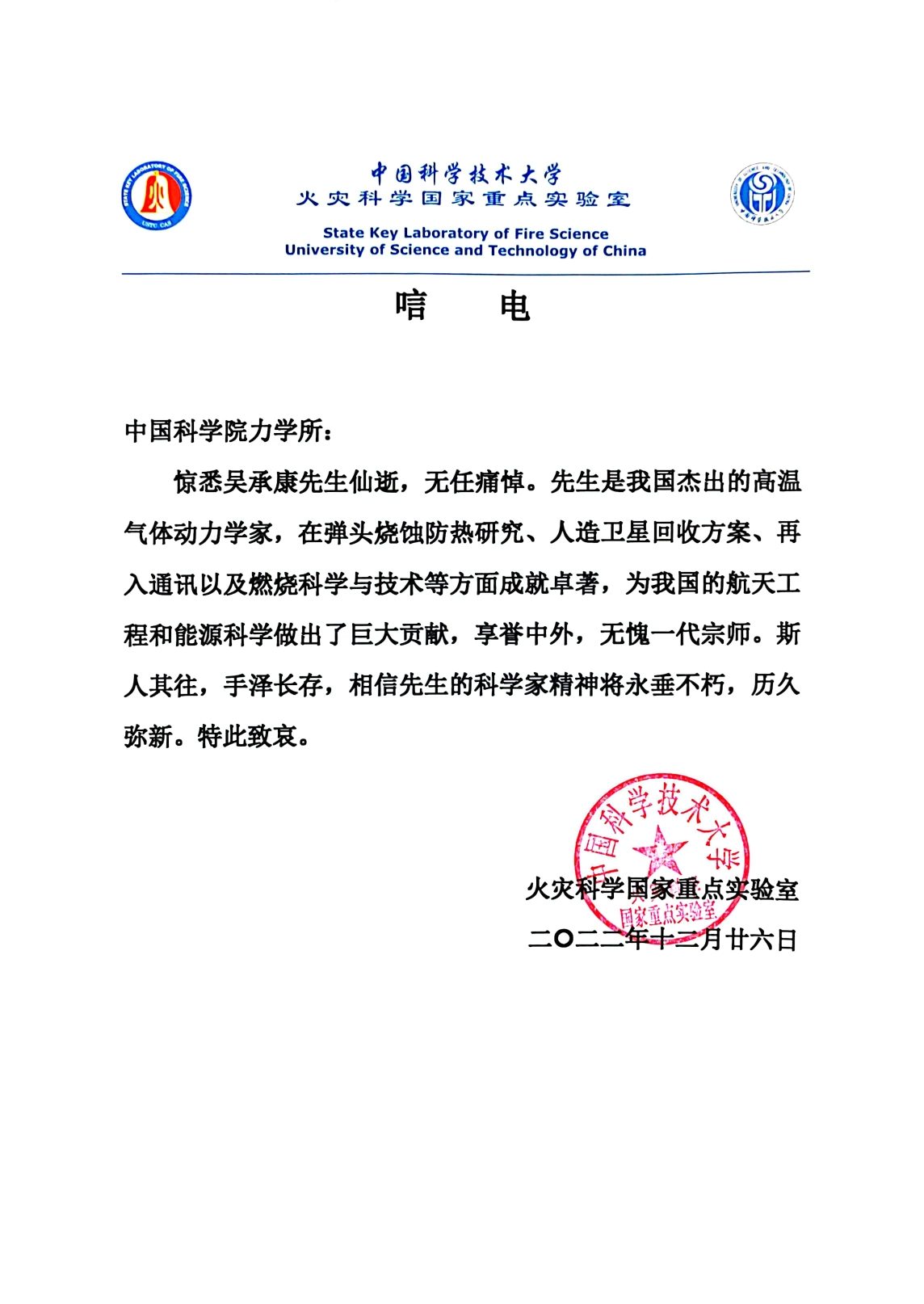 中国科学院技术大学火灾科学国家重点实验室致唁电